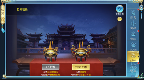 5.仙盟成员可以通过捐献铜钱或元宝进行上香,获取仙盟贡献值。(每种上香一天至多进行一次。)
