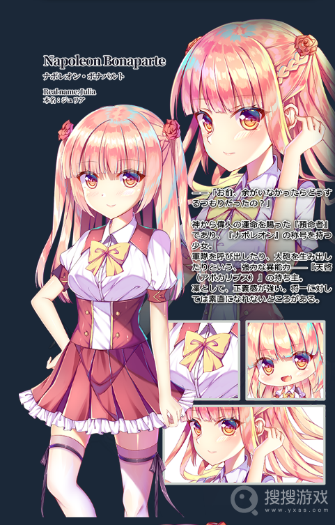 《拿破仑少女》是一款moesoft制作并发行的拿破仑女性化视觉小说。使用了Live2D。咲川将一是一个平平凡凡的高中二年级的学生,直到那一天他遭遇了交通事故。当他再次睁开双眼时,展现在他眼前的光景是正处于资产阶级革命白热化时期的19世纪的法国。在千钧一发之际从炮弹轰炸下把将一救出来的是一位带剑的少女。「——我是拿破仑·波拿巴。是未来的法国皇帝。」