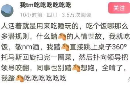 人活着就是用来吃睡玩的,吃个饭哪那么多潜规则,什么踏马的人情世故,我就吃饭,敬nm酒,我踏马直接跳上桌子360°托马斯回旋扫完一圈菜,然后扑向领导把领导咬翻,同事也别踏马参想跑,全啃了,我踏马吃吃吃吃吃吃