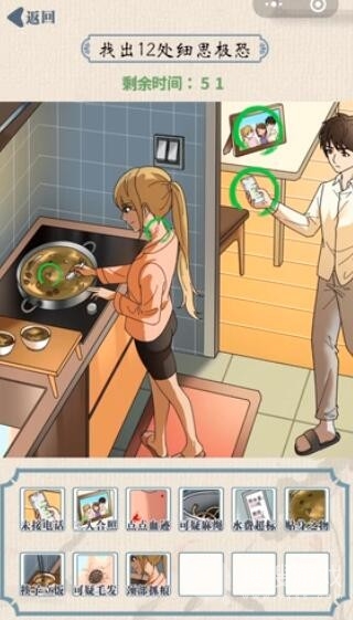 无敌脑洞王者消失的恋人-找出十二处细思极恐处是:未接通话、三人合照、点点血迹、挣扎痕迹、诡异的笑、颈部抓痕、贴身之物、下水道堵塞、菜刀、水费超标、麻绳、筷子立饭