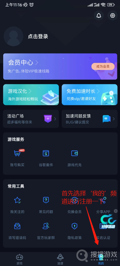 2、打开CC加速器,选择【我的】进行注册,只有注册后才可以使用;