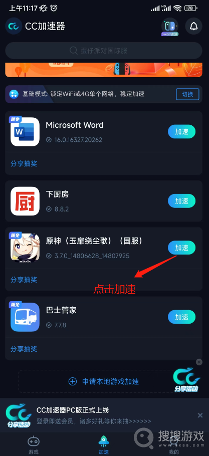 方法三:游戏未在本地区发布,所以进不去,可以尝试用《CC加速器》(点击下载)进行加速(推荐,可以快速登录)