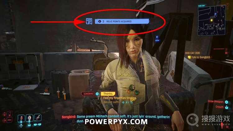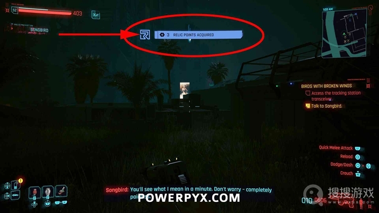当你在狗镇入口处第一次遇到鸣禽时,你在目标“与鸣禽交谈”中自动获得3个遗物点数。不能错过。对话选择并不重要。