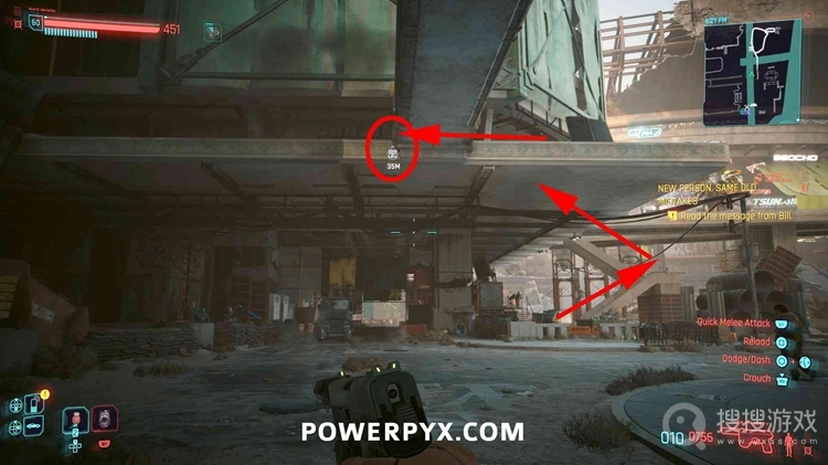 在体育场的最后角。经过所有的商铺,继续直行,直到你到达体育场的尽头,不能再往前走了。然后右转,找到一小组楼梯和一个脚手架。您可以蹲在脚手架下找到它后面的数据终端。请注意,在地图上跟踪图标时,它有时会显示错误的路径,并试图将您指向缺少电源的关闭门的方向,这是一个导航错误,而不是正确的路径。你不需要穿过需要电力的门,只需继续直奔体育场的尽头(下图显示了地图上标记的正确路径)。您可以步行进入体育场,前往狗镇北部并上楼梯,或快速前往数据术语“EBM Petrochem体育场”。