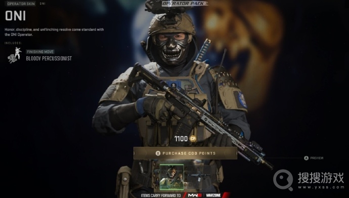 《COD:MW2》中PS限定角色Oni现已可在PC和Xbox平台上通过花费1100CP点数获得。该角色为PS商店的预购奖励,于今年10月27日结束独占期。《COD:MW3》即将于11月10日发售,需要注意的虽然游戏可继承前作内容,但是之前PS版免费领取的Oni等非积分购买的东西是锁定平台的,故玩家若更换了平台的话就无法继续使用。