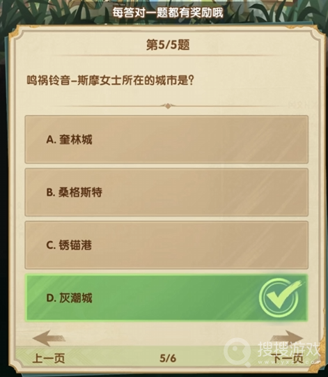 鸣祸铃音-斯摩女士所在的城市是哪个? 正确答案:灰潮城