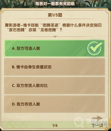 鞭影游者-维卡的技能“图腾圣迹”是根据什么条件来决定刻印“滚石图腾”或“龙卷图腾”的? 正确答案:敌方可选人数