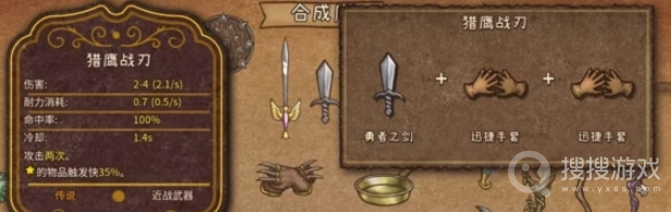 要合成猎鹰战刃,你需要将1把勇者之剑和2双迅捷手套组合在一起。勇者之剑的制造材料是1把木剑和2块磨刀石。