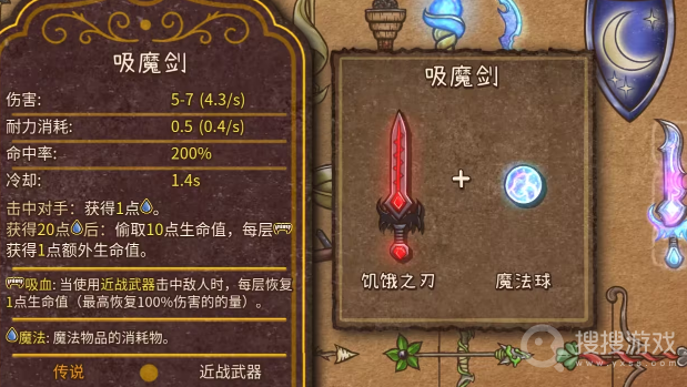 一旦积累了20点魔法,吸魔剑将偷取对手10点生命值,并且每一层吸血效果都可以为持有者额外恢复1点生命值