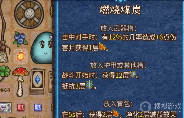 如果将燃烧煤炭放入护甲或其他槽位,在战斗开始时,你将获得12层华护盾,并提供3层的冰冻抵抗。