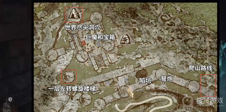 你是否了解斯芬克斯的支线任务呢?这个任务隐藏在古战场遗迹之上的世界尽头洞穴中,具体位置如下所示。