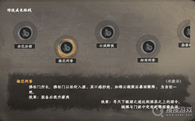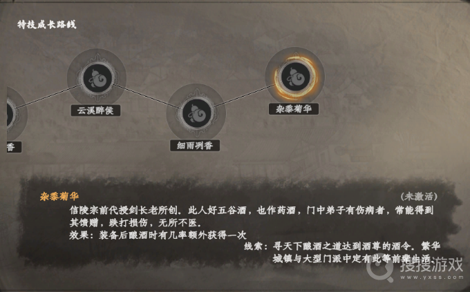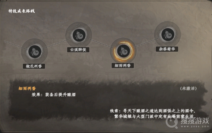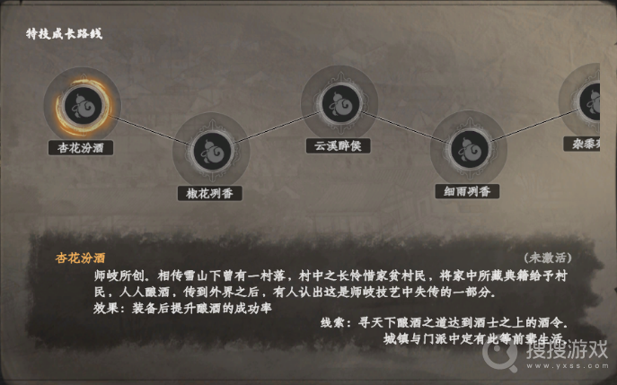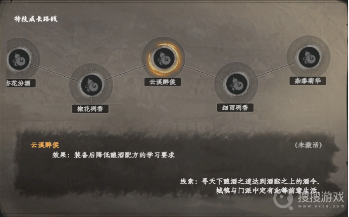 云溪醉侯:装备此特技后,玩家将能够降低酿酒配方的学习门槛,轻松掌握各种酿酒技艺。