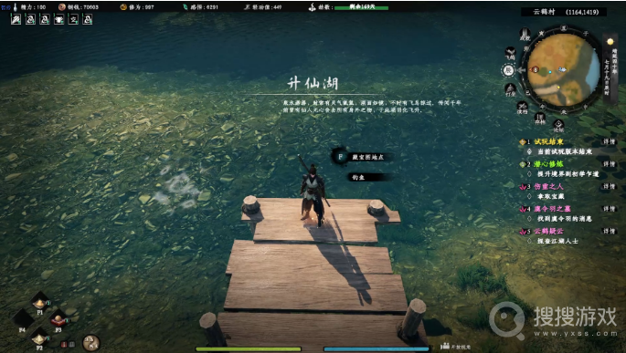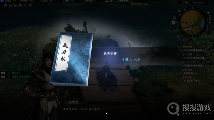 步骤四:根据藏宝图的指引,来到云鹤村外升仙湖边的码头(坐标:1164,1419)。在那里,找到了一本名为《藏刀术》的秘籍。拿起秘籍,任务完成。