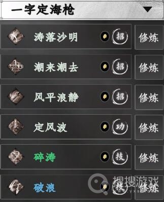 一字定海枪是枪棍流派的入门武学,以外攻伤害为主,共有3个招式、1个功体和2个秘技。