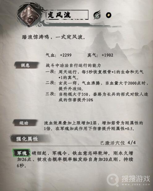 定风波,不仅是一字定海枪的功体,更是你战斗中的得力助手。无论是调息的被动效果,还是运功的主动加成,都让你在战斗中更加如鱼得水。而强化后的军魂,更是让你的刚属性达到巅峰。