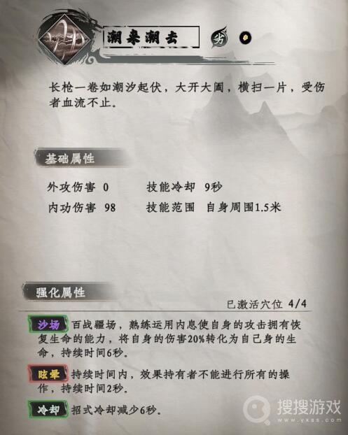 潮来潮去,不仅是对敌的攻击,更是对自己的守护。周围的敌人,都将受到其内功的震慑。沙场效果,更让你在战斗中,气血源源不断;而眩晕,则让敌人陷入短暂的迷茫。