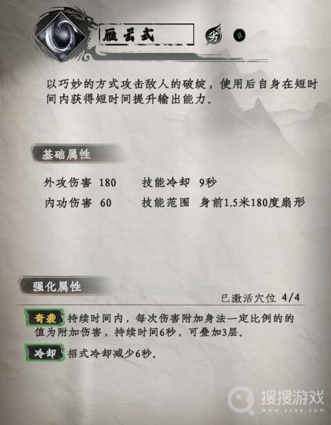 此秘技赋予角色的每次攻击额外的伤害能力,伤害值为角色的柔属性×0.3。同时,它还能使雁九天招式获得一段强大的落日击效果,使角色在战斗中更具威胁性。