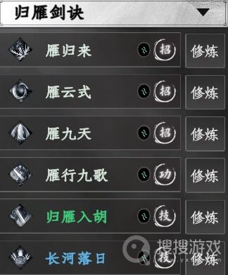 归雁剑法是剑术流派中的基础武学,以直接的外攻伤害为主轴。它涵盖了三个招式、一个功体以及两个秘技,共同构成了这套完整的剑法体系。
