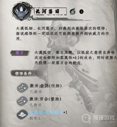 要领悟此秘技,玩家需要激活会阴(任脉)和百会(督脉)两个穴位,并获取技能卷·长河落日。