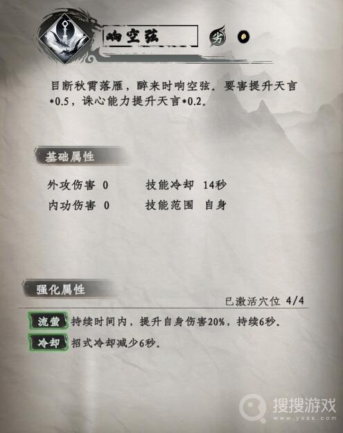 响空弦:这一招不同于寻常的攻击方式,它更多的是一种增益状态。当施展此招时,施招者的要害值与诛心值都会得到显著提升,仿佛一把紧绷的弓弦,随时准备发出致命的一击。