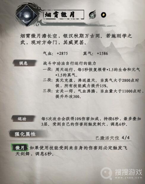 烟霄微月:这不仅是凌霄剑法的核心功体,更是一种对天地元气的精妙运用。在调息状态下,施招者能不断恢复气血与真气,为接下来的战斗做好准备。而在运功状态下,每一次攻击都能为施招者带来额外的伤害加成,使其如虎添翼。