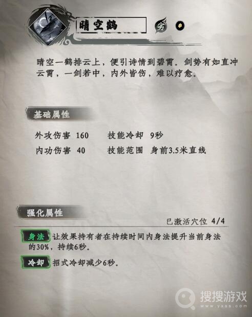 晴空鹤:此招一出,如晴空中的仙鹤展翅高飞,凌厉的剑气直逼敌人,造成大范围的外攻与内功伤害。其特效更是能让施招者身法灵动,如临风而立,翩若惊鸿。