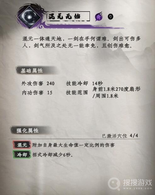 此招威力惊人,攻击范围广阔,扇形区域与圆形区域皆受波及。基础外攻伤害为240,内功伤害为15,技能冷却时间为20秒。影响范围包括身前1.8米270度扇形以及周围1.8米。其强化属性——混元,能附加一定比例自身最大气血值的伤害,使得此招更加致命。