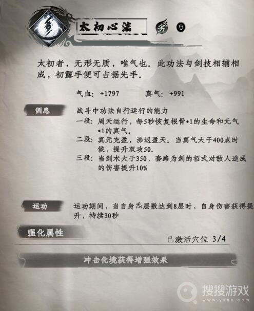 此心法独特非凡,具有调息与运功双重效果。调息状态下,每5秒恢复一定气血与真气。运功时,若炁层数达到8层,则提升自身伤害,持续30秒。