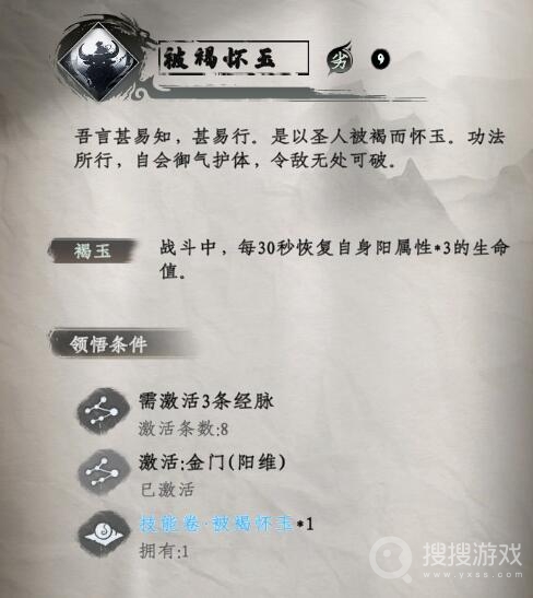 领悟条件:完整激活任意3条经脉,激活-金门(阳维),技能卷·被褐怀玉。