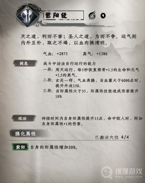 紫阳经是紫阳剑谱的核心功体,它不仅能每5秒恢复一定的气血和真气,还能在特定条件下提升外攻和阳属性技能伤害。其主动效果更是在持续时间内提升自身阳属性,并对敌人造成额外的阳属性伤害。