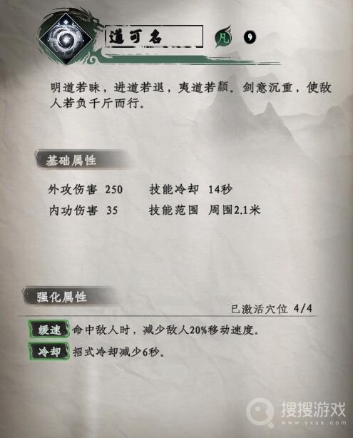 另一招式“道可名”则是对自身周围2.1米内的敌人发动攻击,外攻伤害达250,内功伤害为35。其特效是命中敌人时能减少敌人20%的移动速度,使得敌人在战斗中难以逃脱。