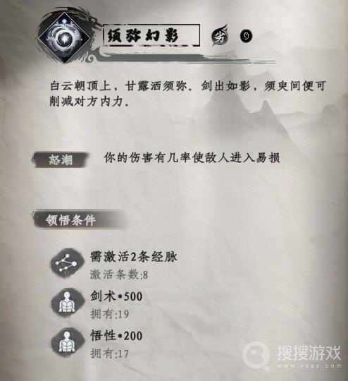 领悟条件:完整激活任意2条经脉,剑术*500,悟性*200
