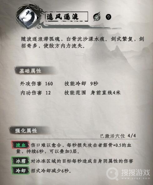 强化属性:使敌人流血,每秒减少筋骨*0.5的气血,可叠加3层,持续6秒。若敌人在冰冻区域,还会受到额外的阴属性伤害。