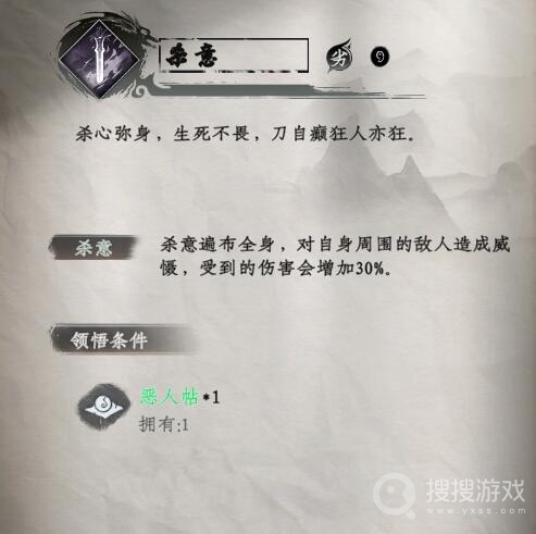 此秘技能使武者全身散发出强烈的杀气,令周围的敌人胆寒,从而增加他们受到的伤害。