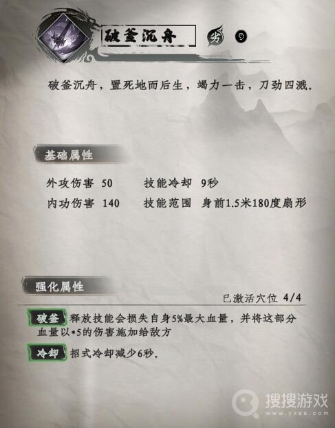 破釜:施展此招时,会牺牲部分气血值,但给予敌人的伤害会大幅提升。