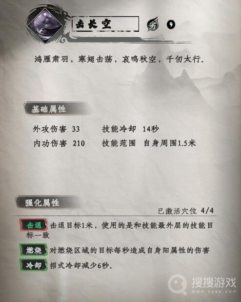 基础属性:外攻33,内功210,20秒冷却,范围1.5米周围。
