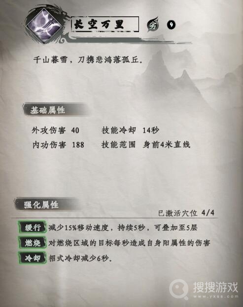 基础属性:外攻40,内功188,20秒冷却,范围4米直线。