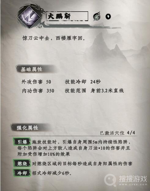 基础属性:外攻50,内功350,30秒冷却,范围3.2米直线。