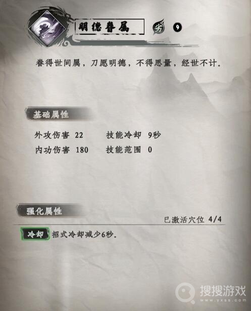 基础数据:外攻伤害22点,内功伤害180点,技能释放间隔15秒,影响范围为身前2米直线。