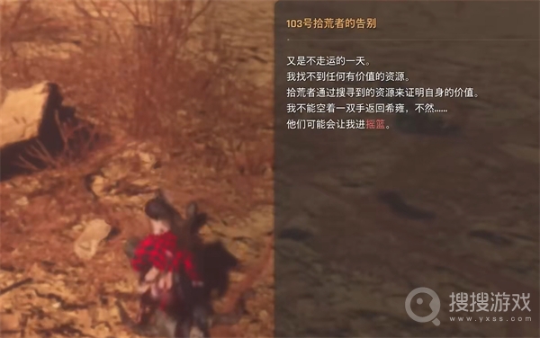 当你成功将所有怪物一一击败后,可以开启视野搜索周围的区域。在草丛的深处,你会意外地发现一具尸体。经过调查,你将获得名为“103号拾荒者的告别”的珍贵线索。