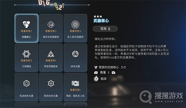 先前收集到的两个破损的武器核心,经过兑换,将化为一颗强大的武器核心,而手中的材料同样可以转化为模块等实用物品,充分展现了收集材料的重要性。