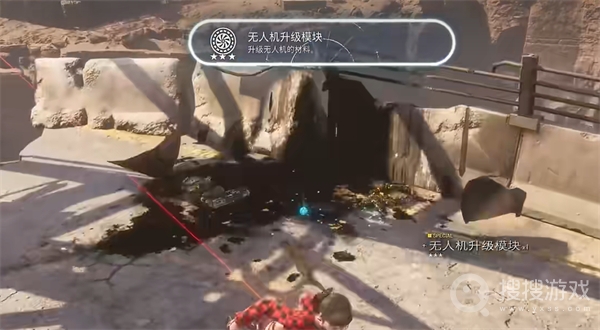 在断桥的中央,我发现了一个掉宝怪。我再次挥动刀剑,将其击败,成功获得了两个珍贵的无人机升级模块。
