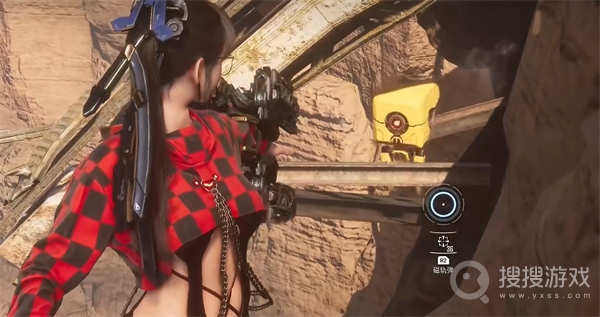 这个平台的边缘有一处断裂的桥梁,小心翼翼地走到边缘,但不必直接跳下。只需要稍微降低身位,站在下面的石头上,用枪击碎那些束缚住机器人的钢筋。