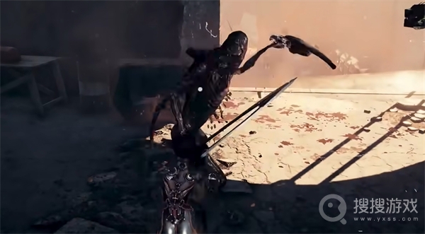 跨过塔吊,右侧一间房门前的怪物引起了我们的注意。在跳跃的瞬间,我们必须迅速做出格挡动作,随后迅速退入房间,以防被怪物击落。