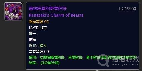 魔兽世界游戏中,雷纳塔基的野兽护符是用材料合成的,玩家需要用猎人职业打孔的巫毒人偶、格里雷克之血、雷纳塔基之牙、乌苏雷之鬃和哈扎拉尔的梦境之丝作为材料。