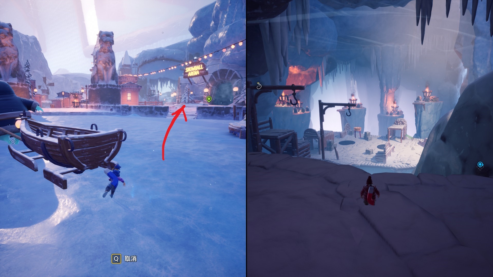 进入需要三座破冰塔的小镇后,激活中间的破冰塔,会看到一处摩天轮,在摩天轮左边的山洞内。
