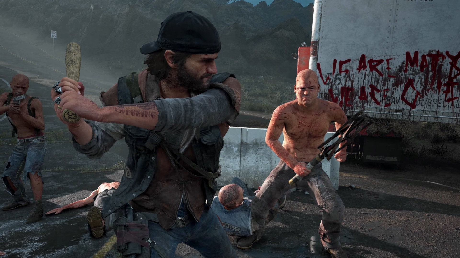 本作中玩家遇到的敌人绝大部分都是暴徒,虽然还有安息者什么的,但本质上是一样的东西。暴徒的作息时间和异変者相反,他们一般只会在白天出没,会携带近战武器或者枪械作为武器。和随处可见的异变者不同,大部分暴徒会试图伏击敌人。常见的伏击点有各种补给站(例如检查哨和加油站)。另外他们还会在马路上放条绳子,很容易就能看清,一旦中招主角就会摔下车,机车的耐久度也会瞬间降到最低。最后一种埋伏方式是狙击手,他们会待在树上向行驶中的玩家射击,命中率很高,玩家看到红外线瞄准以后就需要立即下车找掩体了。