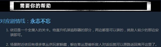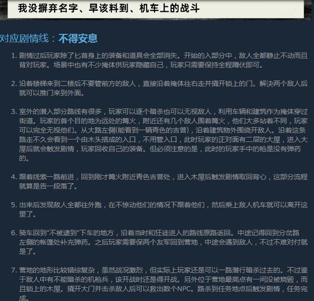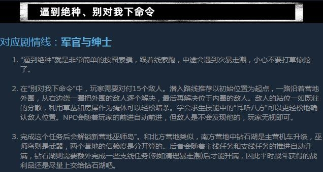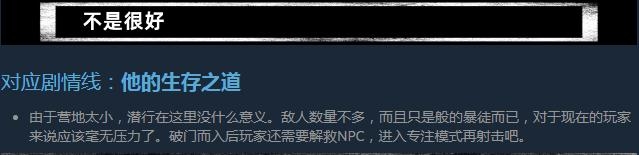 1.扫荡埋伏营的教学关卡,潜入部分可以参考之前的章节“山上的浪迹者”。提前在原处利用望远镜(方向键个)标出敌人位置然后潜入可以让战斗轻松不少,另外提醒一下那些习惯了其他开放世界游戏,诸如“《孤岛惊魂》系列”的玩家,本作的所有据点都没有“警报系统”,玩家被发现后除了会被敌人攻击以外没有任何副作用,敌人数量和强度都不会发生任何变化,嫌麻烦的玩家如果弹药充足,直接开战的难度实际上并不算高。