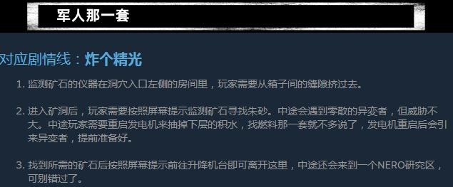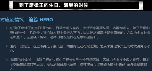 1.解锁NERO检查哨的教学关卡,恢复电力所需的汽油可以在拖车后找到。另外在恢复电力之前,玩家必须要先把场景中所有的扩音器都破坏掉,屋顶上的可以靠近后用刀割掉,位于高处的就只能用枪打掉了。建议使用消音器,随身武器的消音器可以在小型车辆的车盖处随机搜刮到。作为玩家遇到的第一个检查哨,这个检查哨的敌人数量很少。
