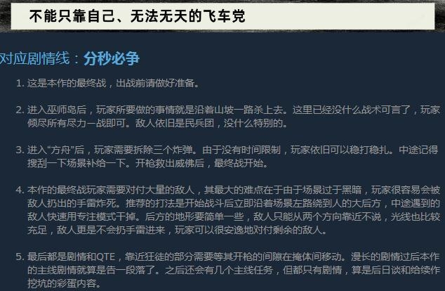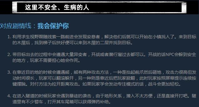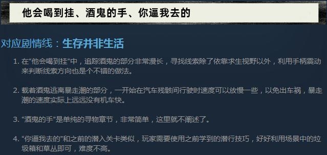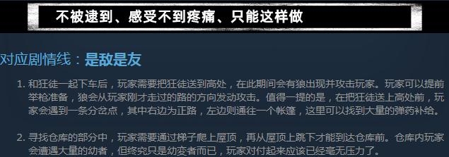 1.游戏的教学关,没什么好说的,玩家可以借此来熟悉一下本作的一些基本操作特别是机车的驾驶手感。在解决了里昂后,玩家需要收集素材然后造一个绷带,造完之后还需要使用绷带才能继续剧情。